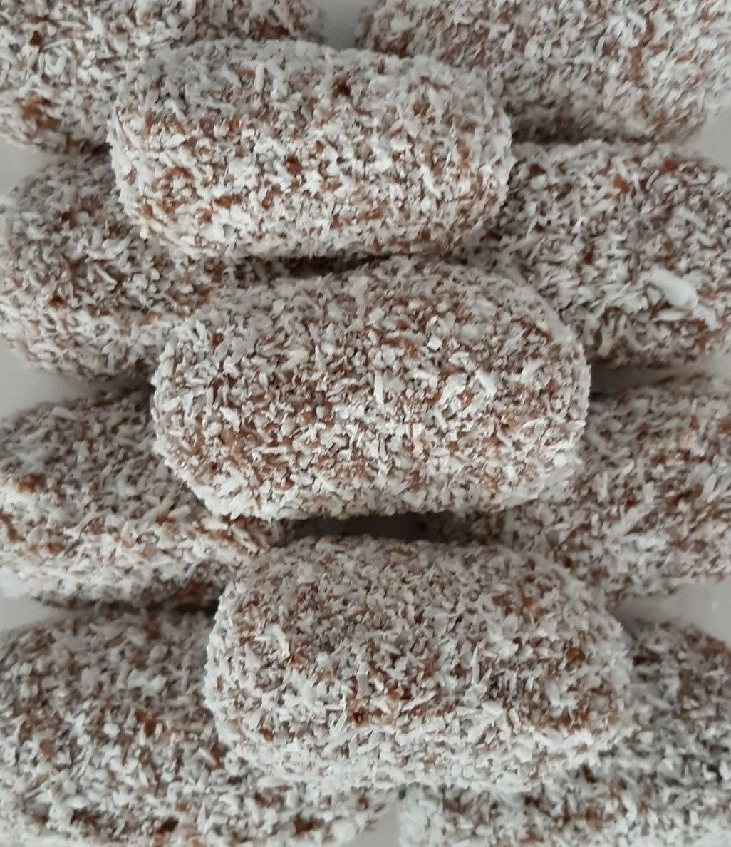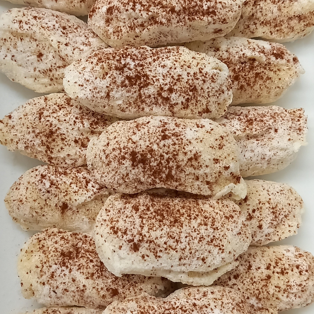 een heerlijke romige vulling met een lichte koffiesmaak, in een jasje van witte chocolade met poedersuiker en natuurlijk met een snufje cacao