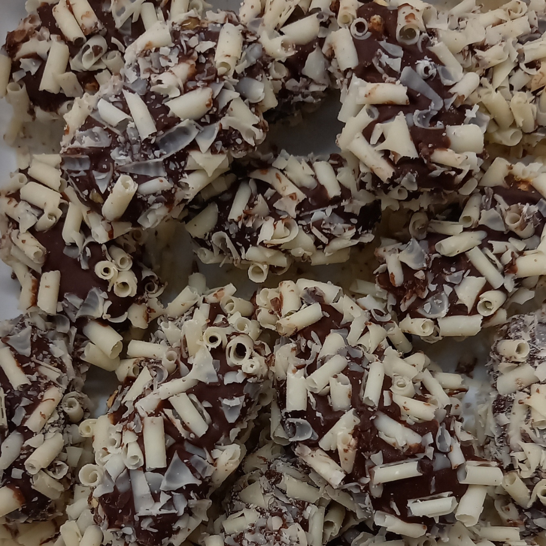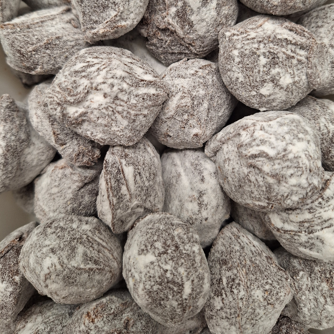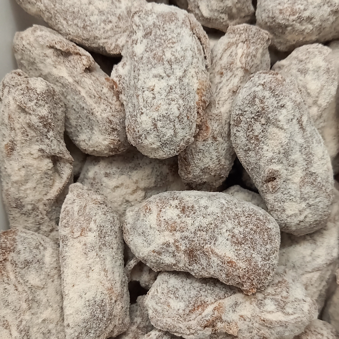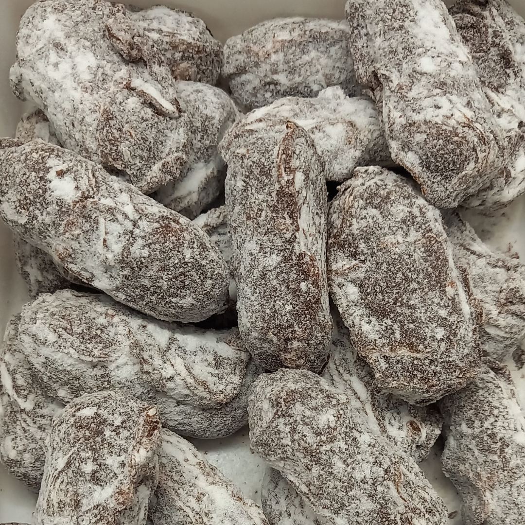 Een romige vulling met karakteristieke pepernootkruiden gehuld in pure chocolade met poedersuiker met anijszaad.