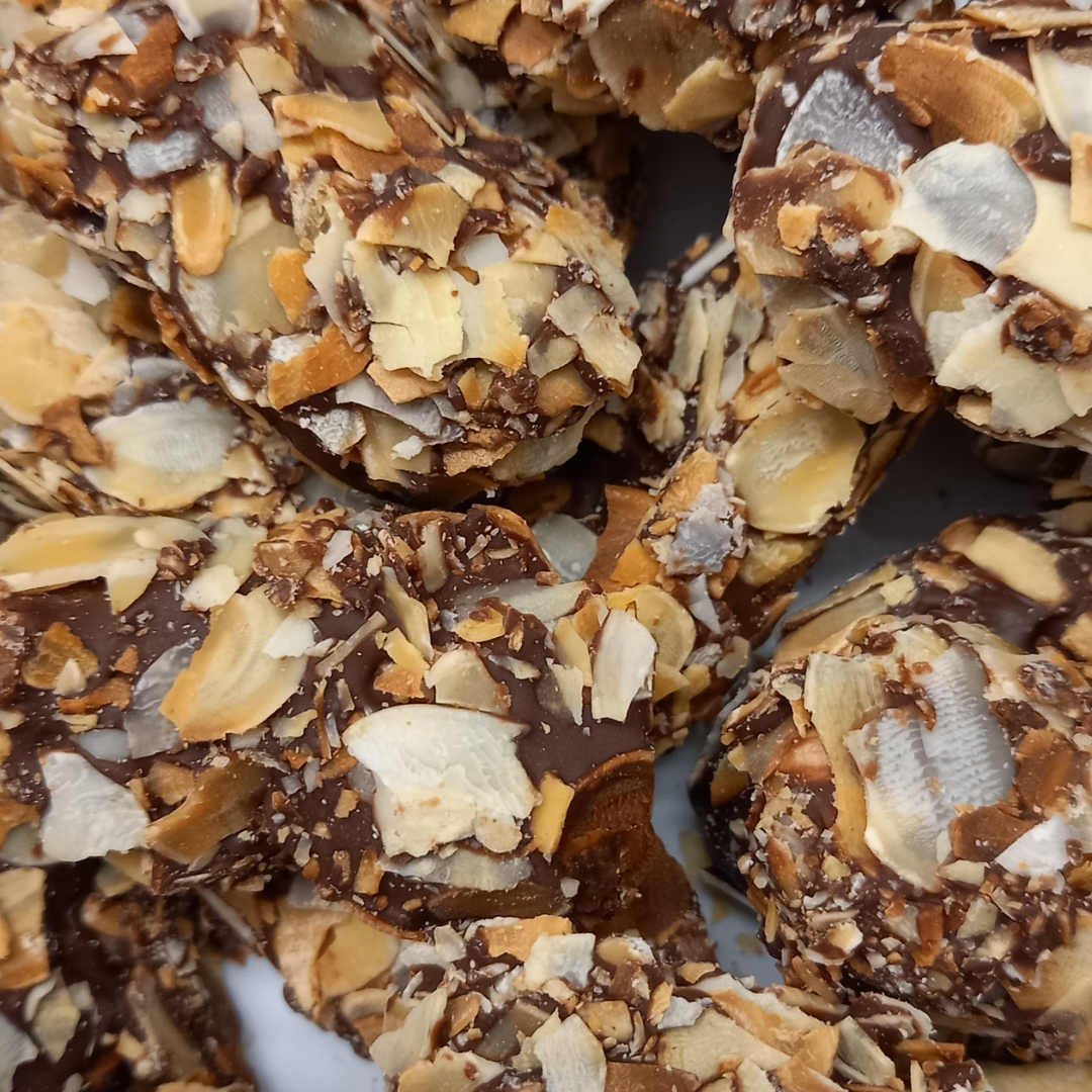 een romige vulling met Amaretto en melkchocolade in pure chocolade met gebrande amandelen