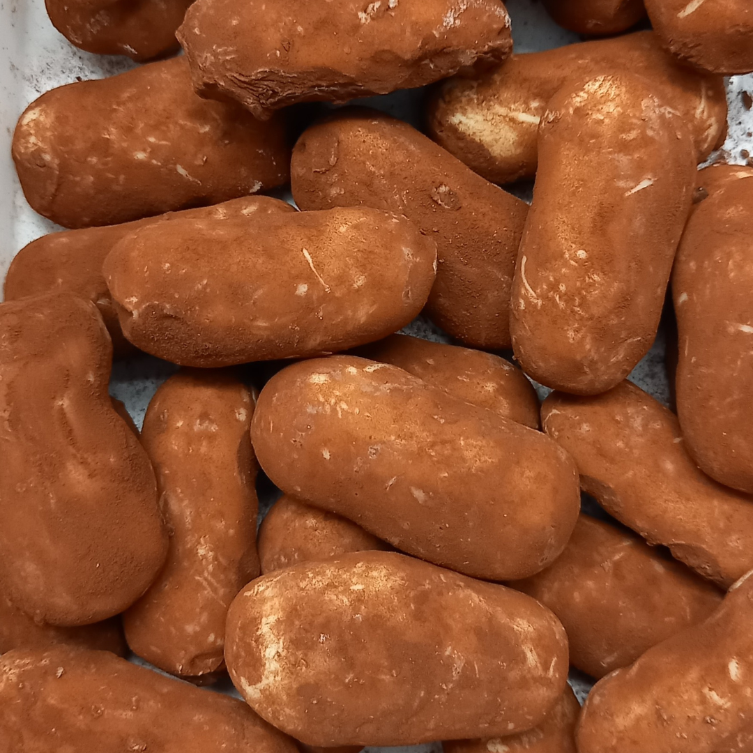 Een romige vulling met speculaaskruiden gehuld in melkchocolade met poedersuiker en speculaaskruiden.