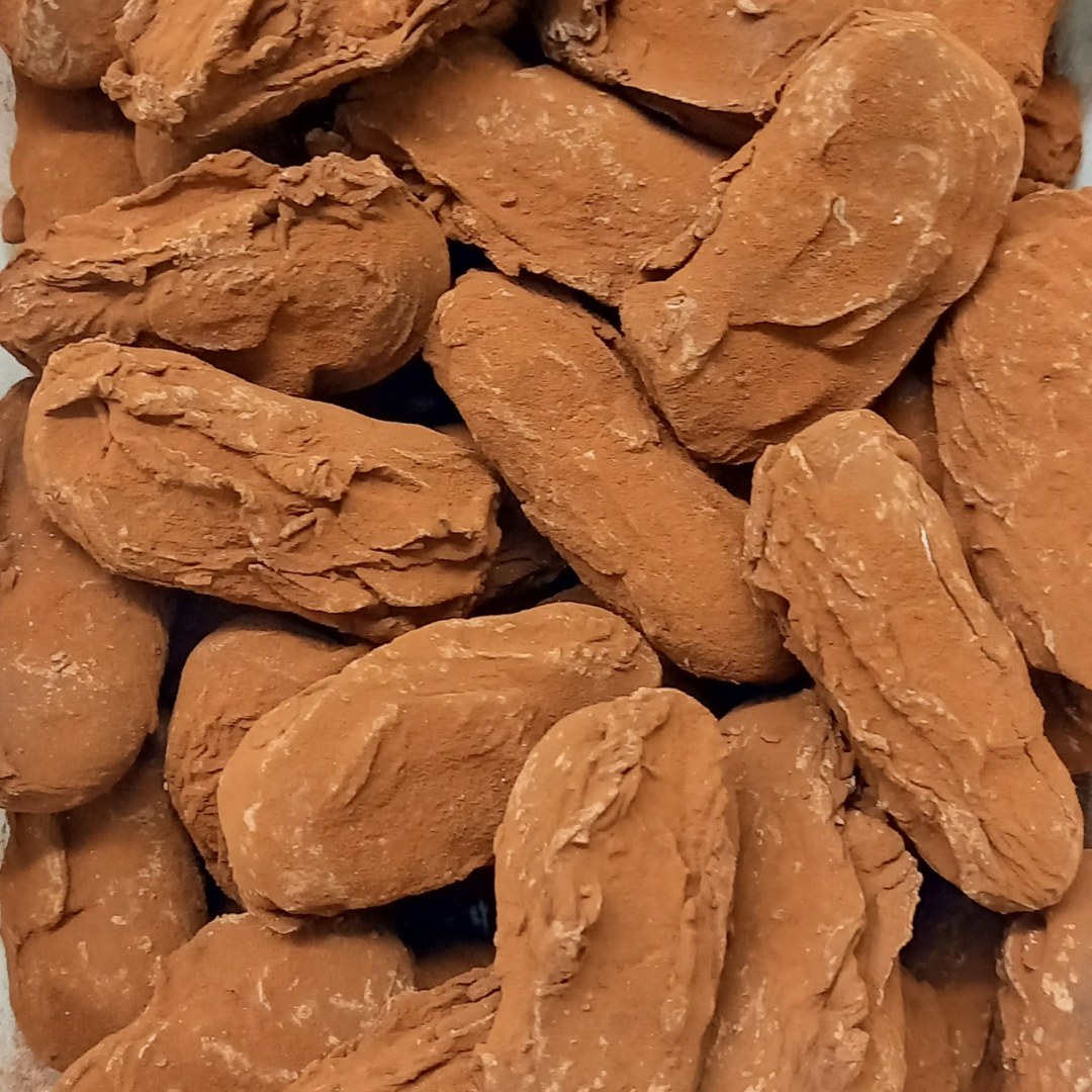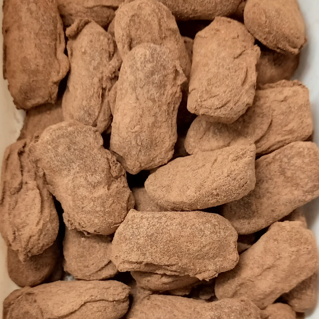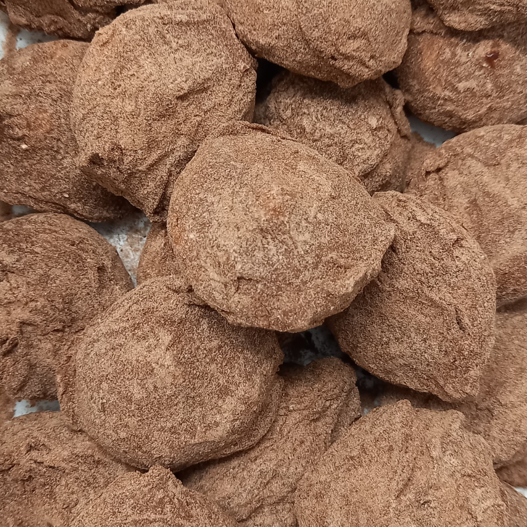 een romige vulling met kaneel gehuld in pure chocolade met poedersuiker, cacao en kaneel