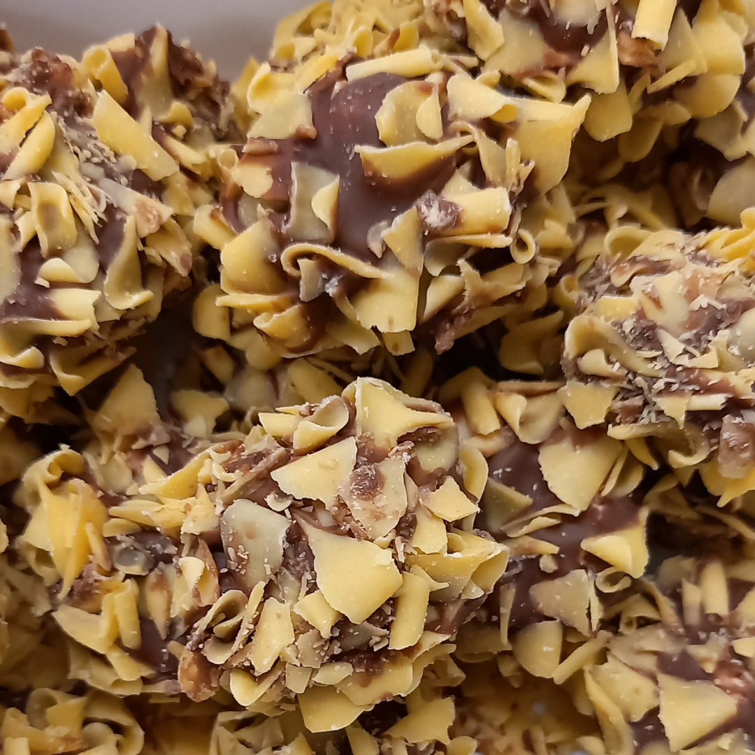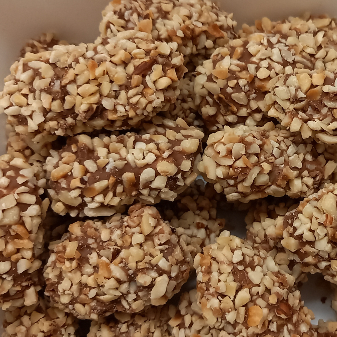 een romige vulling met hazelnootpraliné gehuld in melkchocolade met gehakte hazelnoten
