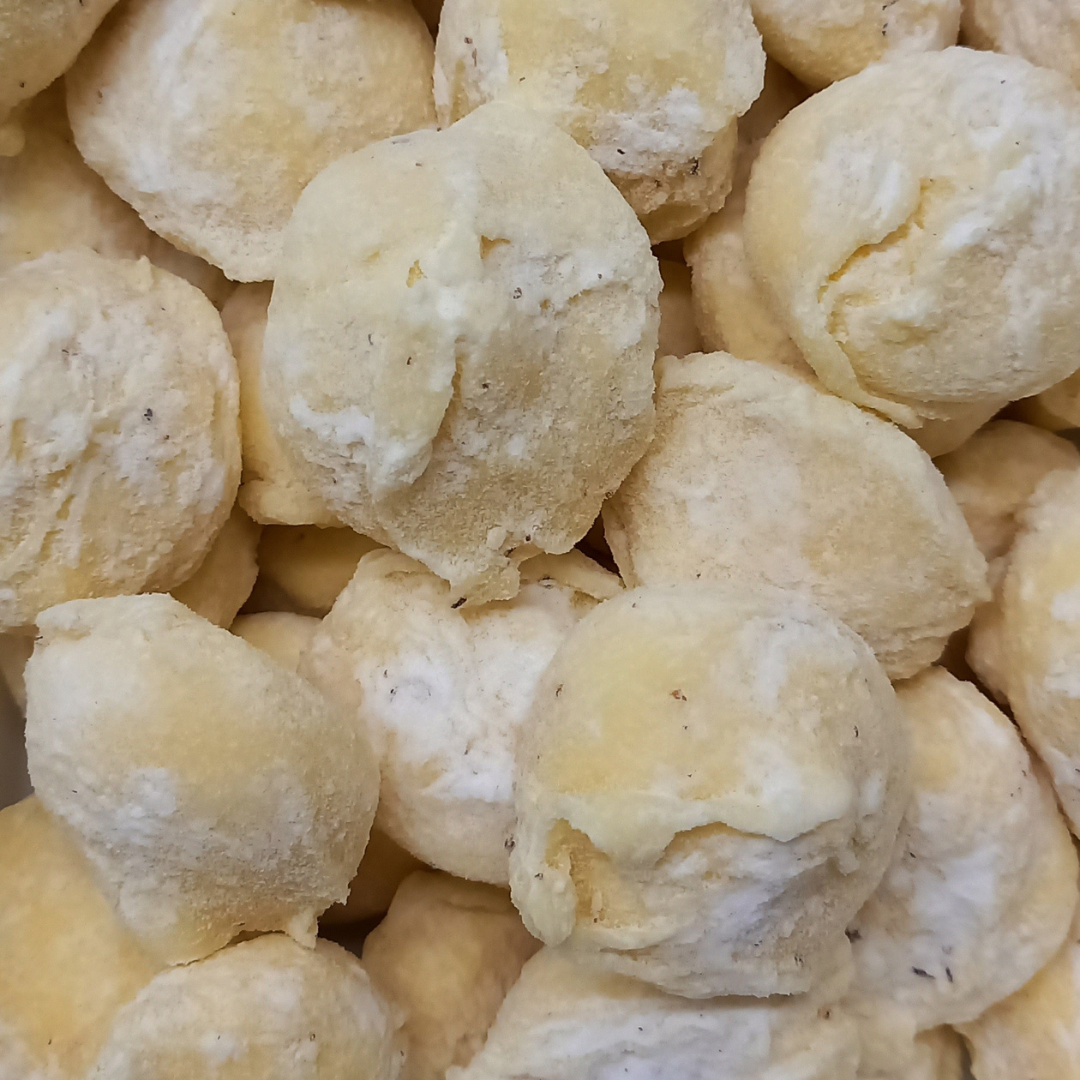Een heerlijke zomerse truffel! Met een frisse zoetzure vulling met passievrucht, mango en room. Gehuld in witte chocolade met poedersuiker.