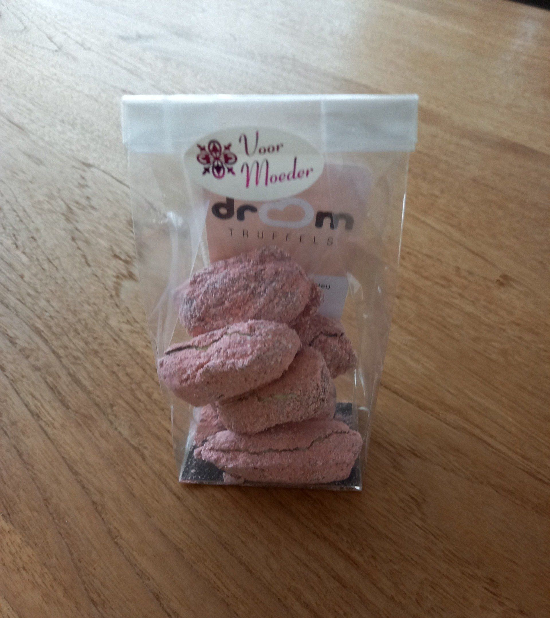 Een leuk aardigheidje is dit zakje gevuld met 6 speciale Moederdagtruffels. Met een heerlijke slagroomvulling en omhuld met pure chocolade en ruby cacao.