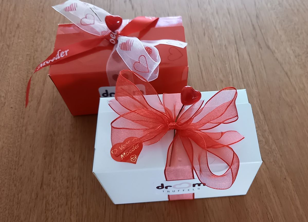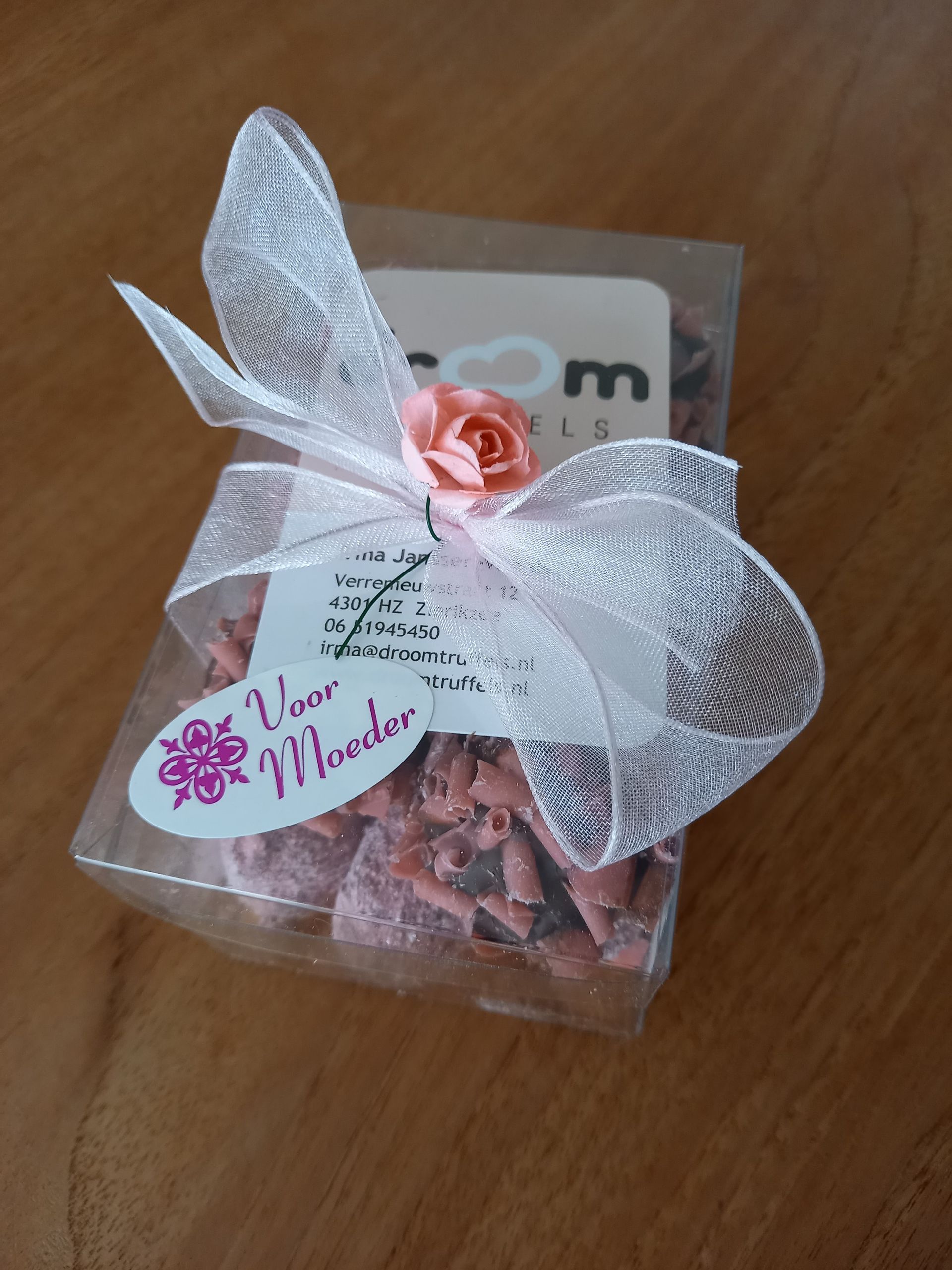 Laat zien wat je geeft! Deze transparante box kan worden gevuld met een assortiment of met een combinatie van Moederdagtruffels en Zeeuwse zwarte bessentruffels. In totaal 11 stuks en speciaal voor Moederdag met passende decoratie.